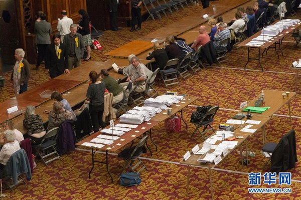 5月26日,在英國南安普敦的一個計票站,工作人員進(jìn)行計票。新華社發(fā)(雷伊·唐 攝)