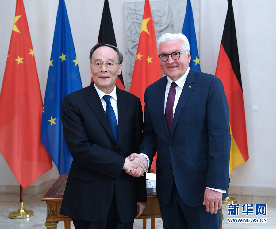 會(huì)見施泰因邁爾時(shí),王岐山表示,中德作為世界主要經(jīng)濟(jì)體和具有重要影響的大國(guó),兩國(guó)關(guān)系超越雙邊范疇,具有全球性意義。近年來(lái),兩國(guó)高層交往密切,各領(lǐng)域合作不斷深化。我愿通過此訪進(jìn)一步推動(dòng)中德全方位戰(zhàn)略伙伴關(guān)系取得新發(fā)展。當(dāng)前兩國(guó)關(guān)系面臨新形勢(shì),雙方應(yīng)通過深化合作為世界樹立合作共贏的典范,通過引領(lǐng)中歐合作為世界注入更多穩(wěn)定因素,通過推進(jìn)全球治理增強(qiáng)維護(hù)多邊主義的力量。