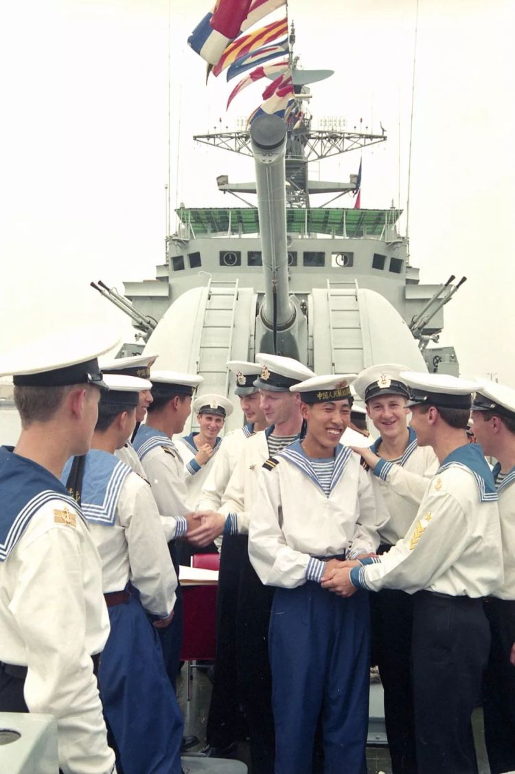 ↑正在山東青島進(jìn)行友好訪問的俄羅斯海軍太平洋艦隊官兵,來到中國海軍艦艇參觀,受到中國水兵的熱情歡迎。(1993年8月26日,新華社稿)