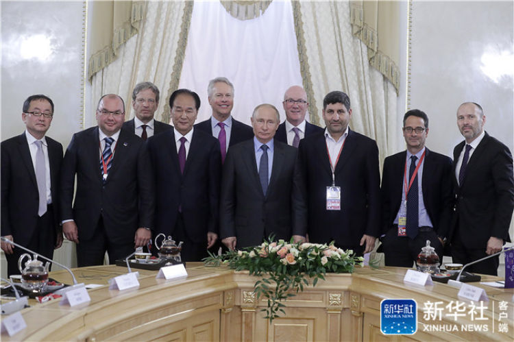 6月6日,在俄羅斯圣彼得堡,俄羅斯總統(tǒng)普京(右五)與新華社社長(zhǎng)蔡名照(左四)等通訊社負(fù)責(zé)人合影。新華社/塔斯社