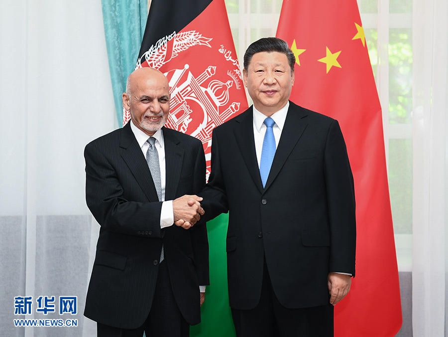 6月13日,國家主席習(xí)近平在比什凱克會見阿富汗總統(tǒng)加尼。 新華社記者 謝環(huán)馳 攝