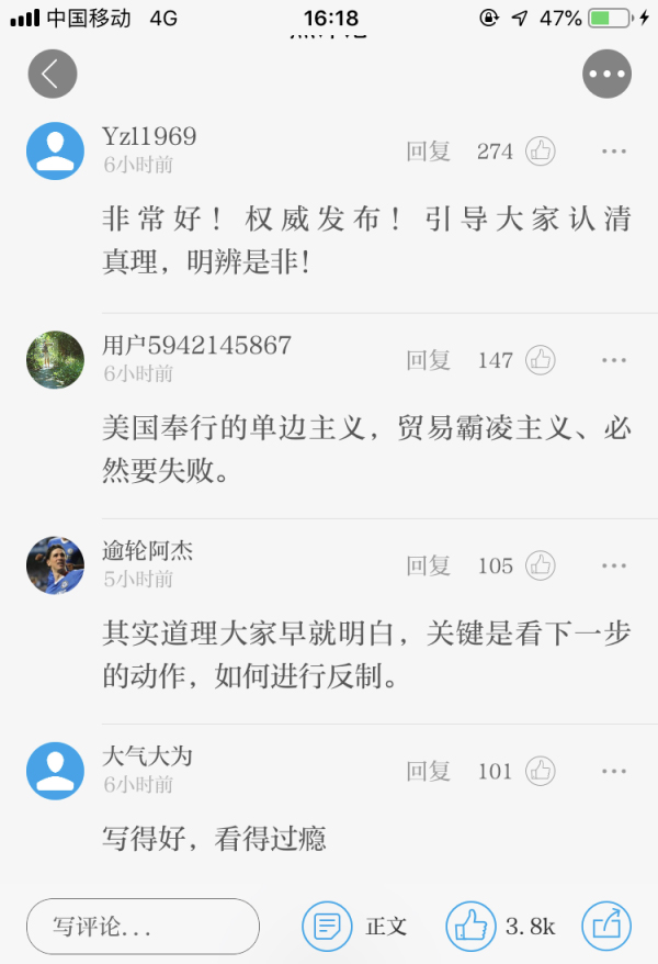 文章刊發(fā)后,網(wǎng)友紛紛轉發(fā)、點贊,表示“全面、清晰且深刻。”“權威發(fā)布!引導大家認清真理,明辨是非!”“美國奉行的單邊主義,貿易霸凌主義、必然要失敗。 ”