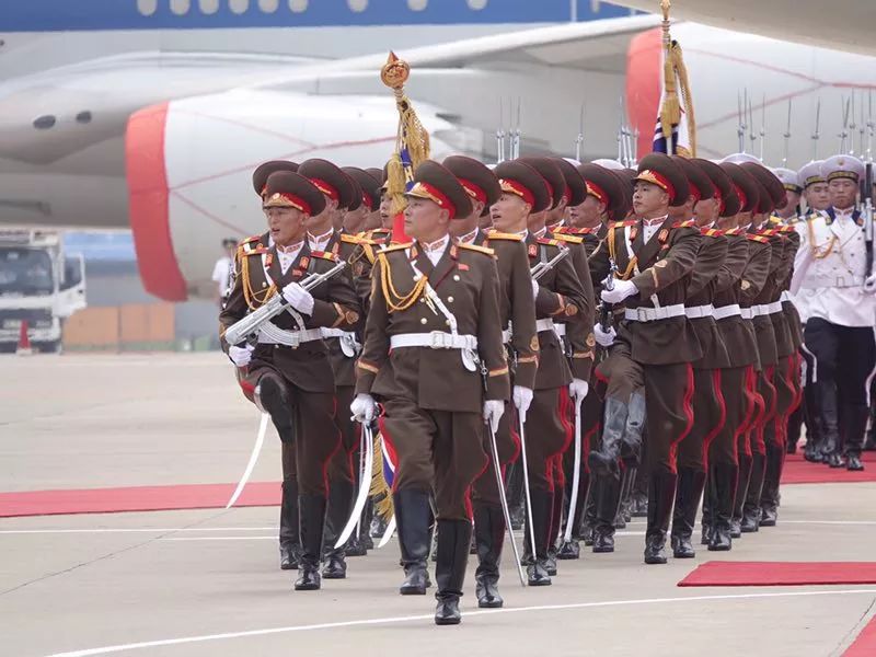 朝方在機場舉行隆重歡迎儀式。在21響禮炮聲中,軍樂隊奏中朝兩國國歌,習(xí)近平在金正恩陪同下檢閱了朝鮮人民軍三軍儀仗隊,并觀看了分列式表演。