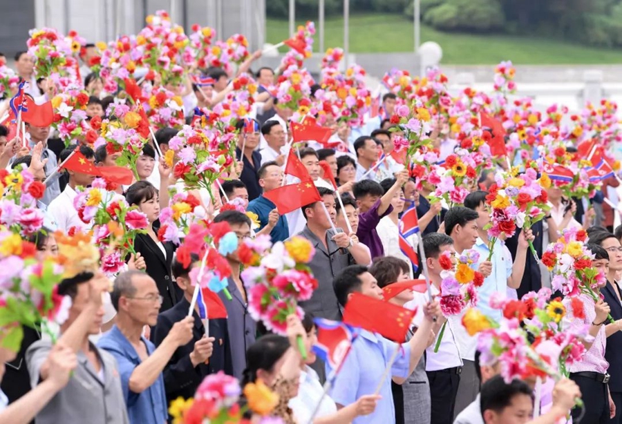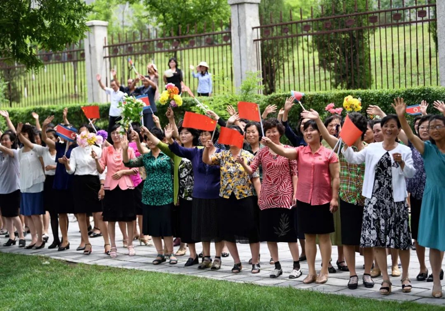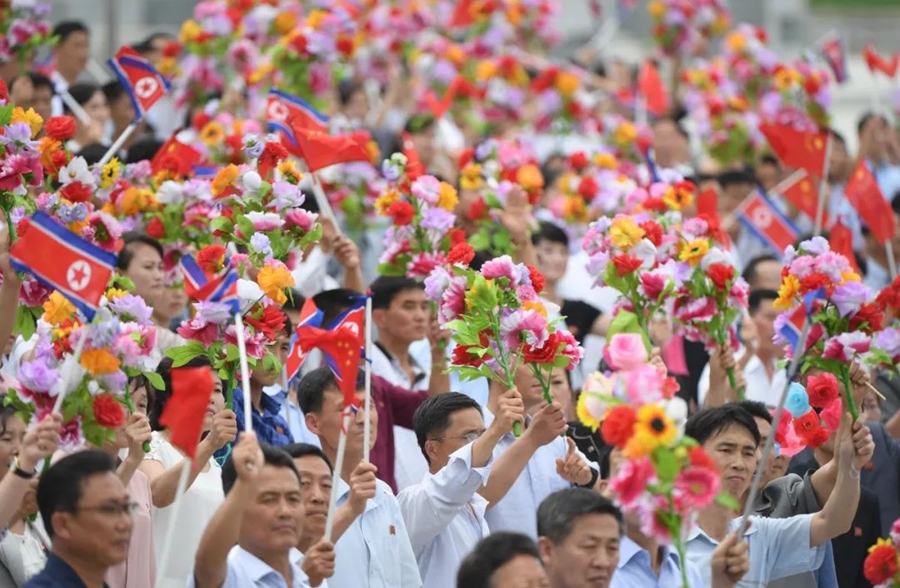 到處都是熱情的笑臉,友好的歡呼聲不絕于耳。習(xí)近平和金正恩向歡迎的人群頻頻揮手致意。
