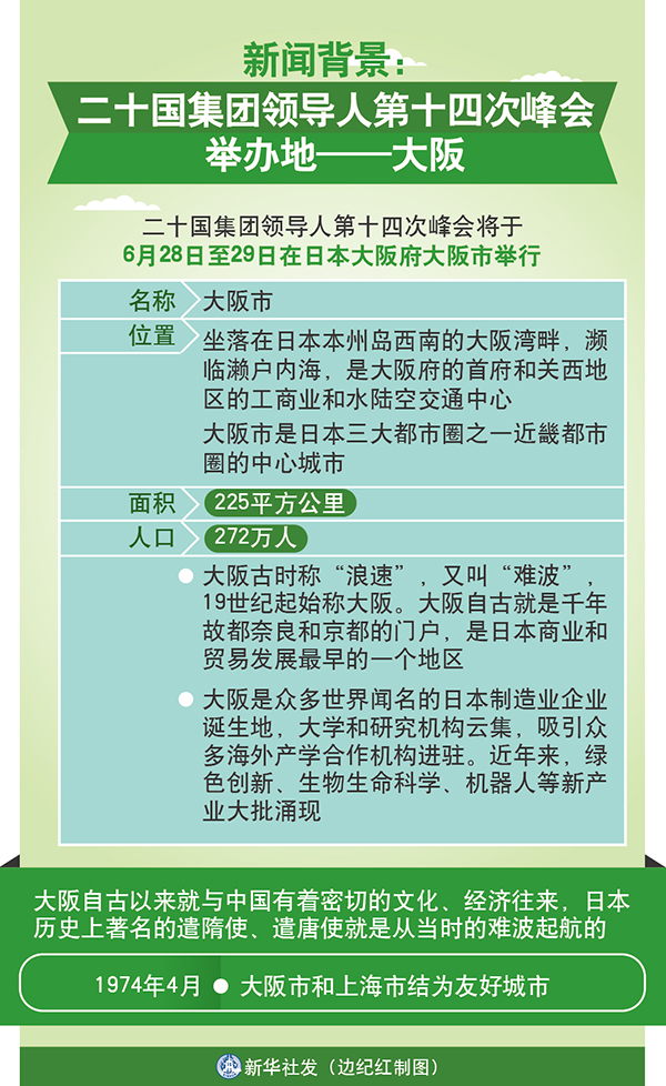 新華社日本大阪6月26日電 新聞背景:二十國集團領(lǐng)導人第十四次峰會舉辦地——大阪