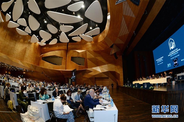 這是7月5日在阿塞拜疆巴庫拍攝的世界遺產(chǎn)大會現(xiàn)場。第43屆聯(lián)合國教科文組織世界遺產(chǎn)委員會會議(世界遺產(chǎn)大會)5日在阿塞拜疆巴庫舉行,會議審議通過將中國黃(渤)海候鳥棲息地(第一期)列入世界自然遺產(chǎn)名錄。該項(xiàng)目成為中國第54處世界遺產(chǎn)。新華社發(fā)(巴巴耶夫 攝)
