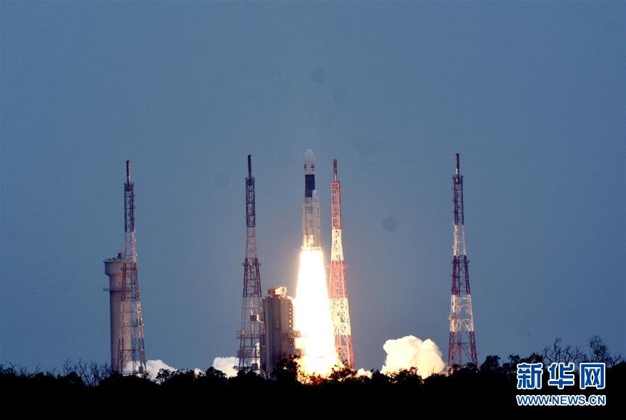 7月22日,在印度安得拉邦的薩蒂什·達萬航天中心,搭載“月船2號”月球探測器的GSLV MK-III運載火箭發(fā)射升空。新華社發(fā)