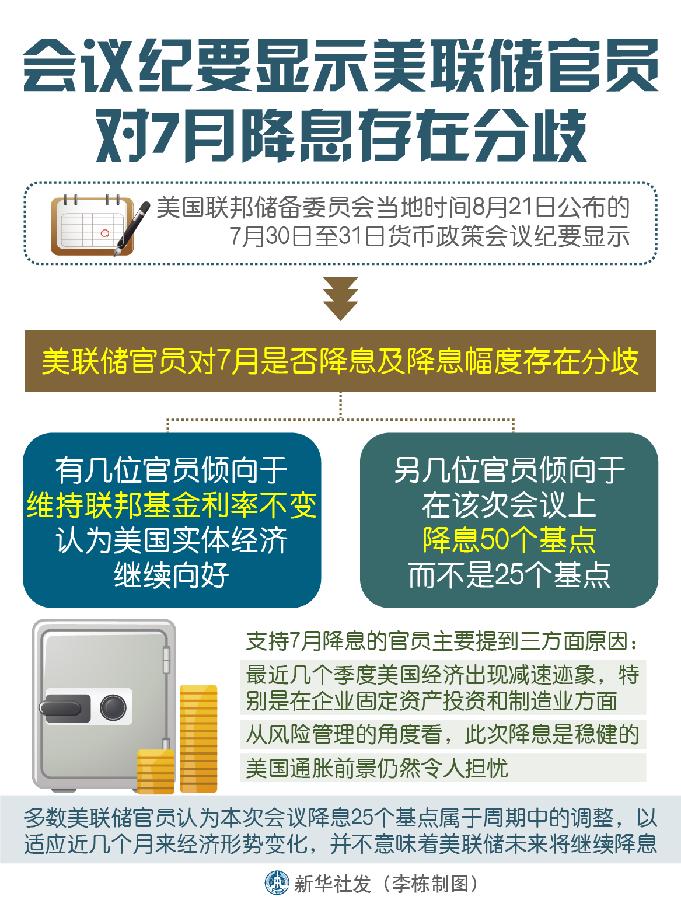 新華社華盛頓8月21日電(記者 高攀 楊承霖)美國(guó)聯(lián)邦儲(chǔ)備委員會(huì)21日公布的7月貨幣政策會(huì)議紀(jì)要顯示,美聯(lián)儲(chǔ)官員對(duì)7月是否降息及降息幅度存在分歧。