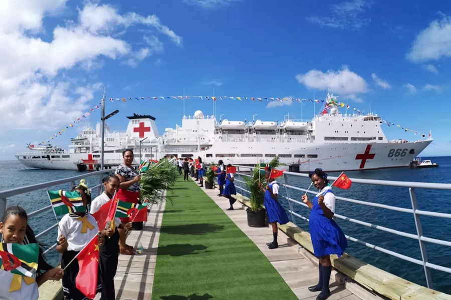 2018年10月12日,在多米尼克首都羅索,當地學生揮動多中兩國國旗歡迎中國海軍和平方舟醫(yī)院船首次到訪。新華社發(fā)