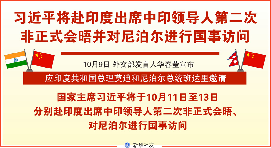 新華社北京10月9日電 外交部發(fā)言人華春瑩9日宣布:應(yīng)印度共和國總理莫迪和尼泊爾總統(tǒng)班達(dá)里邀請,國家主席習(xí)近平將于10月11日至13日分別赴印度出席中印領(lǐng)導(dǎo)人第二次非正式會晤、對尼泊爾進(jìn)行國事訪問。