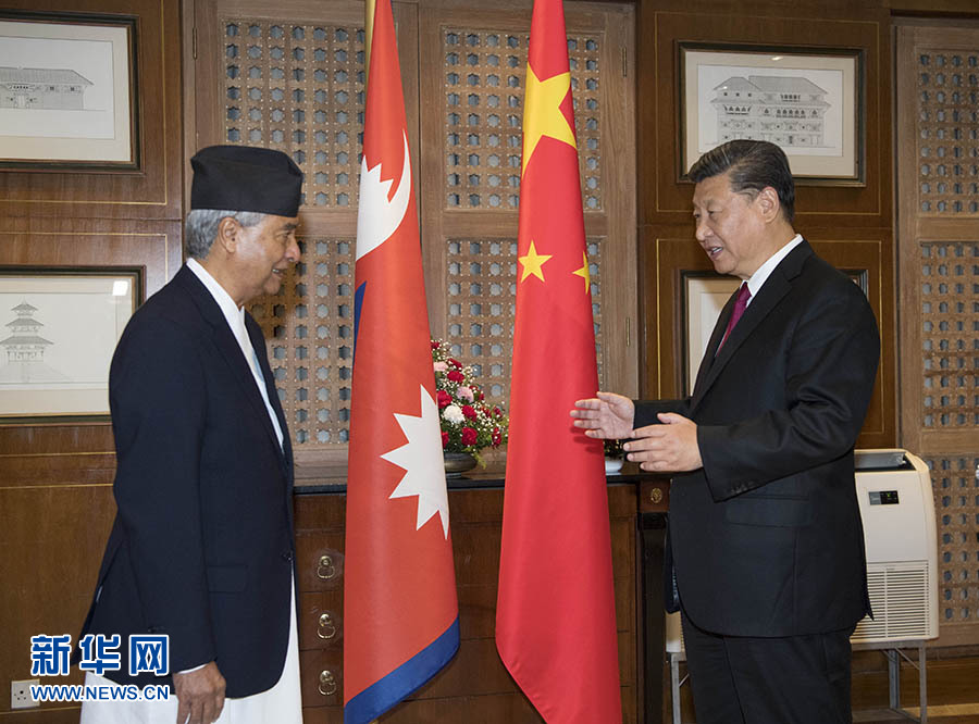 10月12日,國家主席習近平在加德滿都下榻飯店會見尼泊爾大會黨主席德烏帕。 新華社記者 李學仁 攝