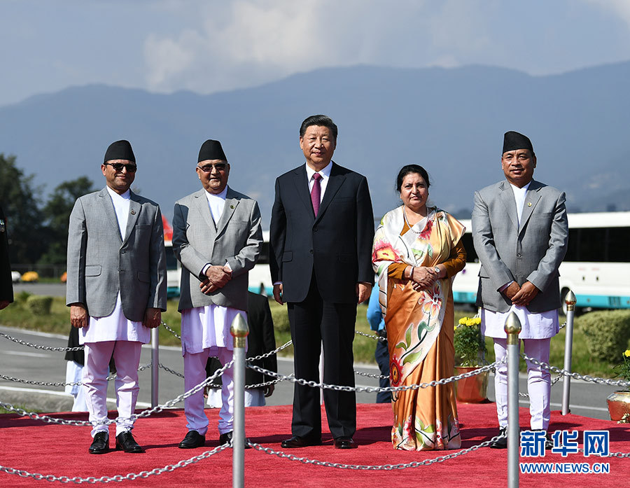 班達里在機場為習近平舉行隆重歡送儀式。尼泊爾副總統(tǒng)普恩、總理奧利、聯(lián)邦議會聯(lián)邦院主席蒂米爾西納、所有內閣成員、軍方高級將領參加。