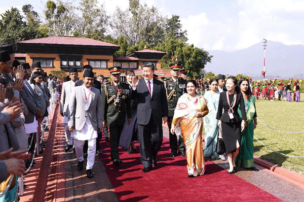 10月12日,國家主席習近平乘專機抵達加德滿都,開始對尼泊爾進行國事訪問。尼泊爾總統(tǒng)班達里在機場為習近平舉行具有濃郁尼泊爾民族特色的歡迎儀式。新華社記者高潔攝