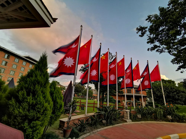 習近平主席在加德滿都下榻的飯店院內飄揚著中尼兩國國旗。新華社記者賴向東攝