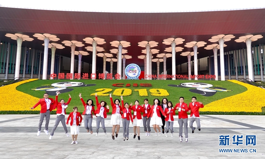 11月4日,第二屆進博會部分志愿者在國家會展中心(上海)南廣場合影留念。 第二屆中國國際進口博覽會將于11月5日上午在上海開幕。 新華社記者 才揚 攝