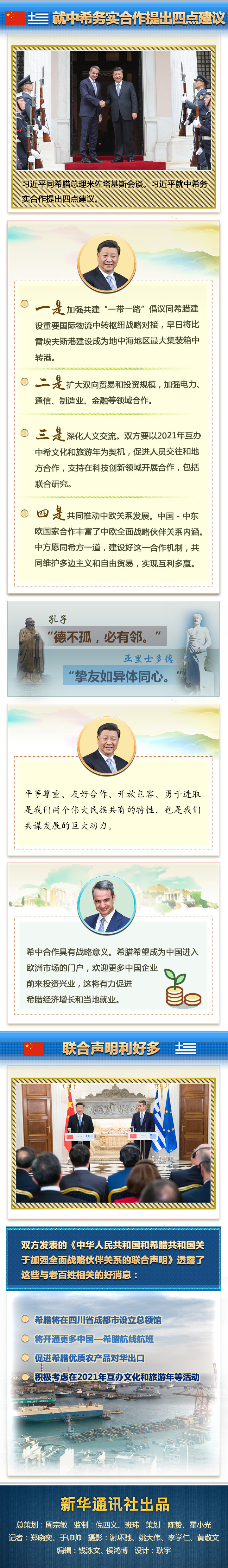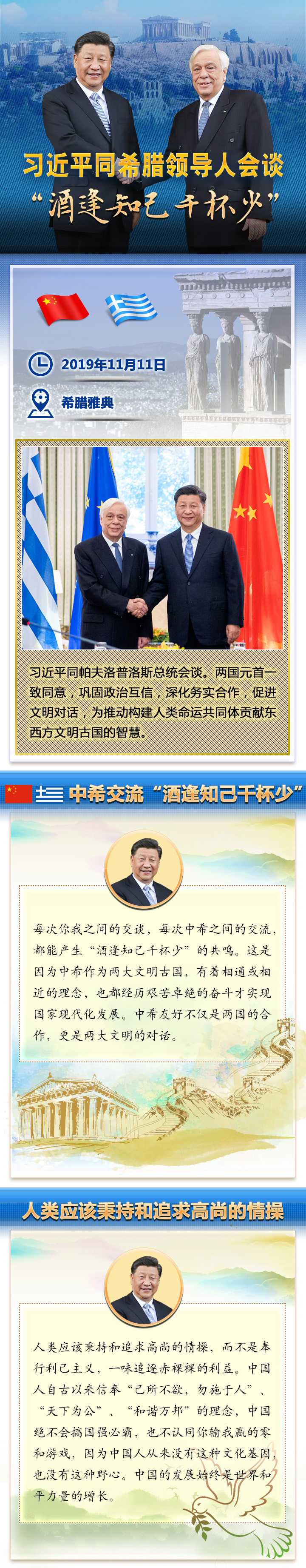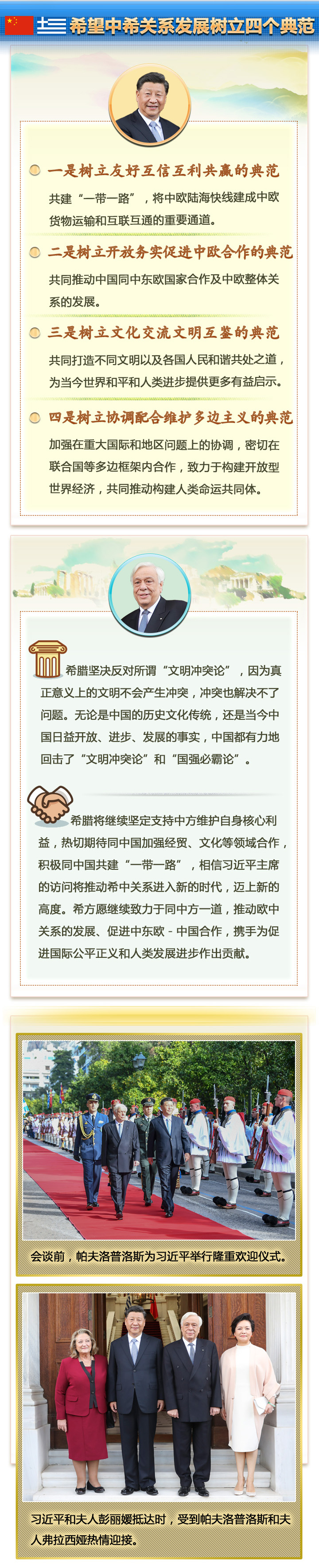 新華社雅典11月12日電 國(guó)家主席習(xí)近平11月10日晚抵達(dá)雅典,開(kāi)始對(duì)希臘進(jìn)行國(guó)事訪(fǎng)問(wèn)。11日上午,習(xí)主席的訪(fǎng)問(wèn)活動(dòng)異常密集:向希臘無(wú)名戰(zhàn)士紀(jì)念碑獻(xiàn)花圈,出席希臘總統(tǒng)帕夫洛普洛斯舉行的隆重歡迎儀式并同帕夫洛普洛斯舉行會(huì)談,旋即又同總理米佐塔基斯舉行會(huì)談、出席合作文本交換儀式、共同會(huì)見(jiàn)記者。中希兩國(guó)領(lǐng)導(dǎo)人就雙邊關(guān)系及共同關(guān)心的國(guó)際和地區(qū)問(wèn)題深入交換意見(jiàn),達(dá)成廣泛共識(shí)。