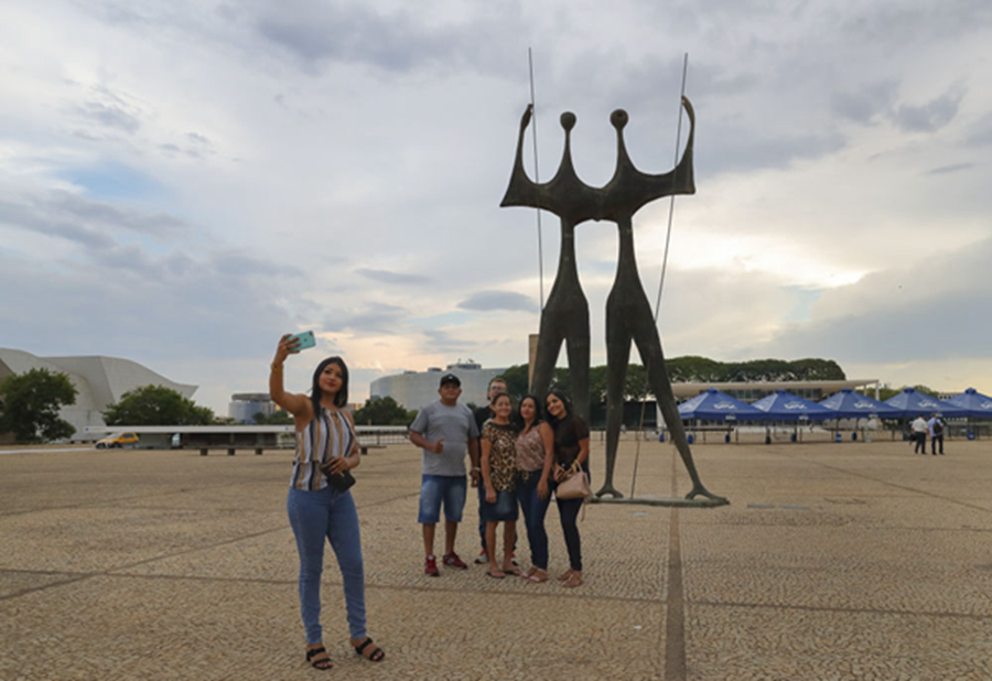 這是2019年11月2日,游人在巴西利亞三權(quán)廣場(chǎng)首都開(kāi)拓者雕像前合影。新華社記者蘭紅光攝