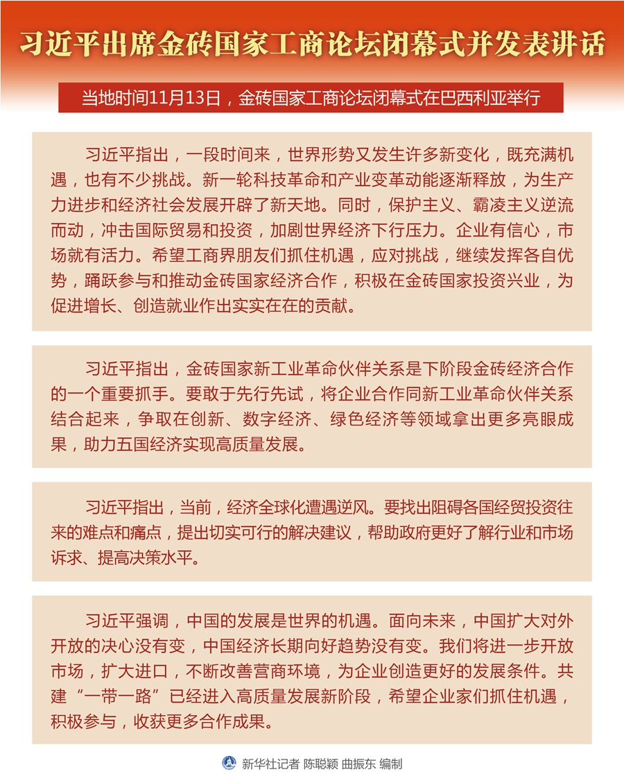 當(dāng)?shù)貢r(shí)間11月13日,金磚國(guó)家工商論壇閉幕式在巴西利亞舉行。國(guó)家主席習(xí)近平出席并發(fā)表講話。 新華社記者 丁海濤 攝
