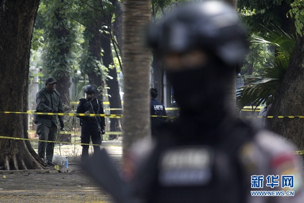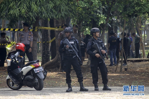 12月3日,在印度尼西亞雅加達(dá),警察在爆炸現(xiàn)場警戒。新華社發(fā)(阿迪蒂亞·伊拉萬 攝)