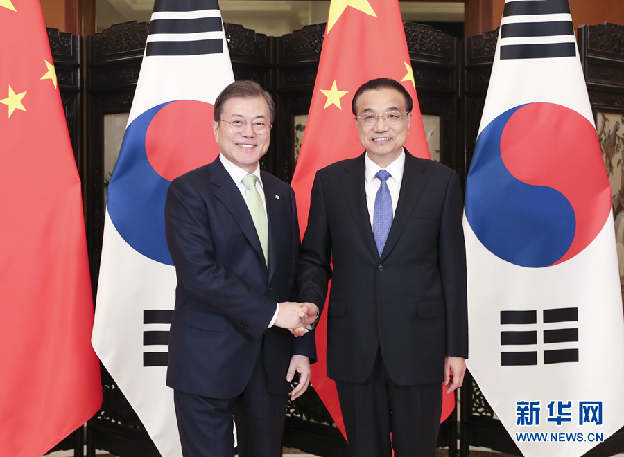 12月23日,國(guó)務(wù)院總理李克強(qiáng)在四川成都會(huì)見出席第八次中日韓領(lǐng)導(dǎo)人會(huì)議的韓國(guó)總統(tǒng)文在寅。新華社記者 丁海濤 攝