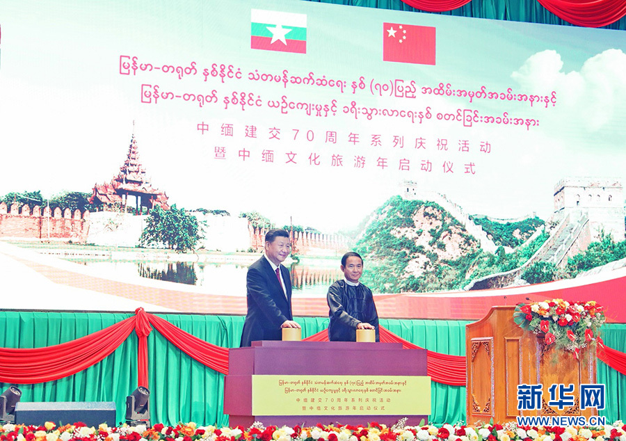 當(dāng)?shù)貢r(shí)間1月17日晚,國家主席習(xí)近平在內(nèi)比都第二國際會(huì)議中心出席中緬建交70周年慶?;顒?dòng)暨中緬文化旅游年啟動(dòng)儀式。這是習(xí)近平和緬甸總統(tǒng)溫敏共同按下按鈕,正式啟動(dòng)中緬文化旅游年。 新華社記者 黃敬文 攝