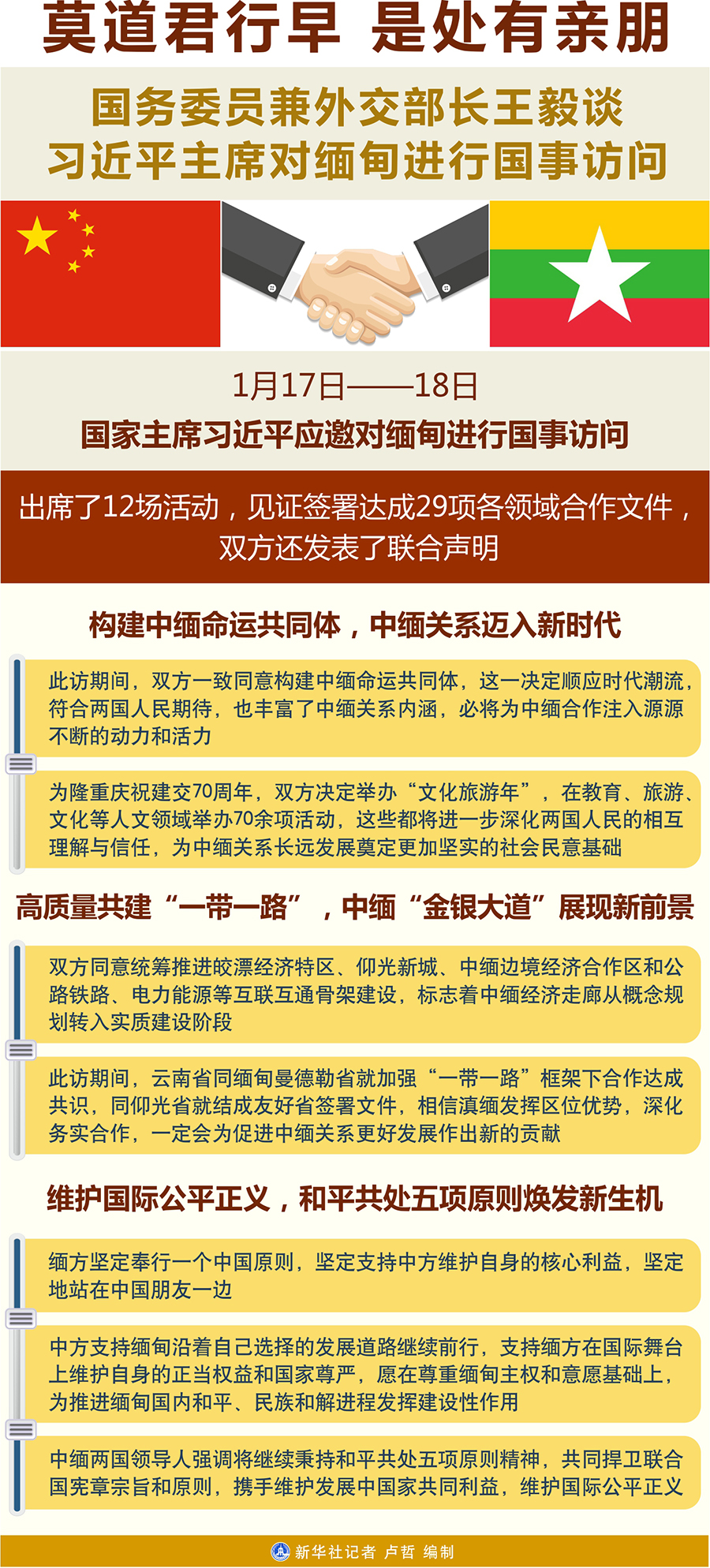 王毅說,習(xí)近平主席新年首訪緬甸,是黨中央著眼外交全局采取的一次重大周邊外交行動(dòng),此訪時(shí)間雖短,但日程緊湊,成果豐碩。習(xí)近平主席出席了12場(chǎng)活動(dòng),見證簽署達(dá)成29項(xiàng)各領(lǐng)域合作文件,雙方還發(fā)表了聯(lián)合聲明。緬方對(duì)習(xí)近平主席此訪期待已久,給予最高禮遇隆重接待。緬甸總統(tǒng)溫敏和國(guó)務(wù)資政昂山素季聯(lián)袂出席重大活動(dòng),緬甸第一、第二副總統(tǒng)及所有內(nèi)閣成員、聯(lián)邦議會(huì)兩院議長(zhǎng)以及主要政黨負(fù)責(zé)人悉數(shù)出面,陪同習(xí)近平主席出席中緬建交70周年系列慶?;顒?dòng)暨中緬文化旅游年啟動(dòng)儀式。
