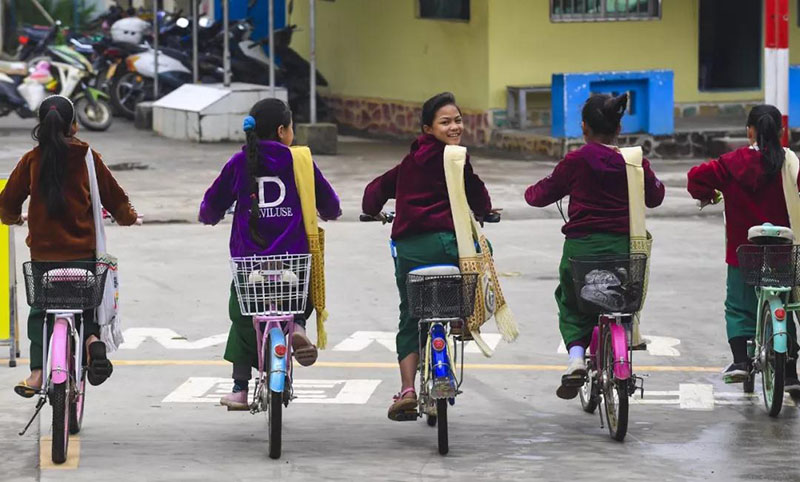 ▲國境線將云南省瑞麗市姐相鄉(xiāng)一個村寨一分為二,中方一側稱銀井,緬方一側稱芒秀,是典型的“一寨兩國”村落。圖為銀井小學幾位緬籍學生騎車回家,跨過銀井邊防口岸國境線。