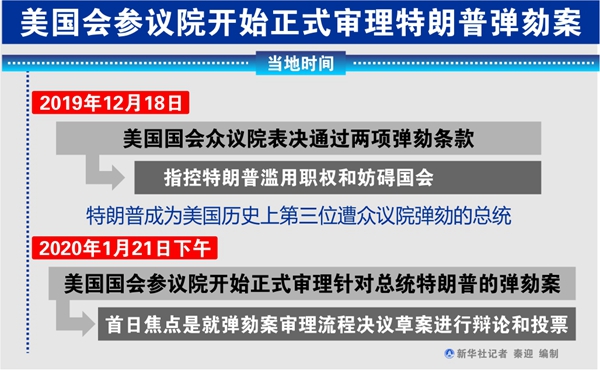 根據(jù)參議院多數(shù)黨(共和黨)領(lǐng)袖麥康奈爾當天正式提交的決議草案,彈劾案審理主要包括開案陳述、交叉提問、參議院就是否傳喚更多證人或檢視更多證據(jù)進行投票表決等階段。