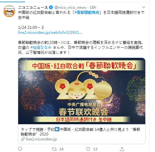 2020年1月24日晚,日本將在線直播中國春晚。來源:日本視頻網(wǎng)站niconico官方社交媒體賬戶截圖