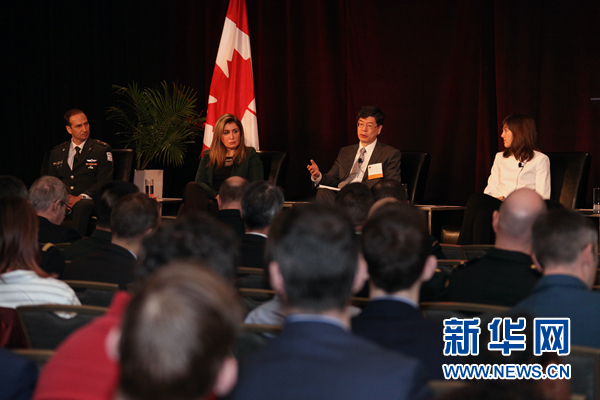 圖為中國駐加拿大大使叢培武(右二)在渥太華安全與防務(wù)會(huì)議上回答問題。記者李保東 攝