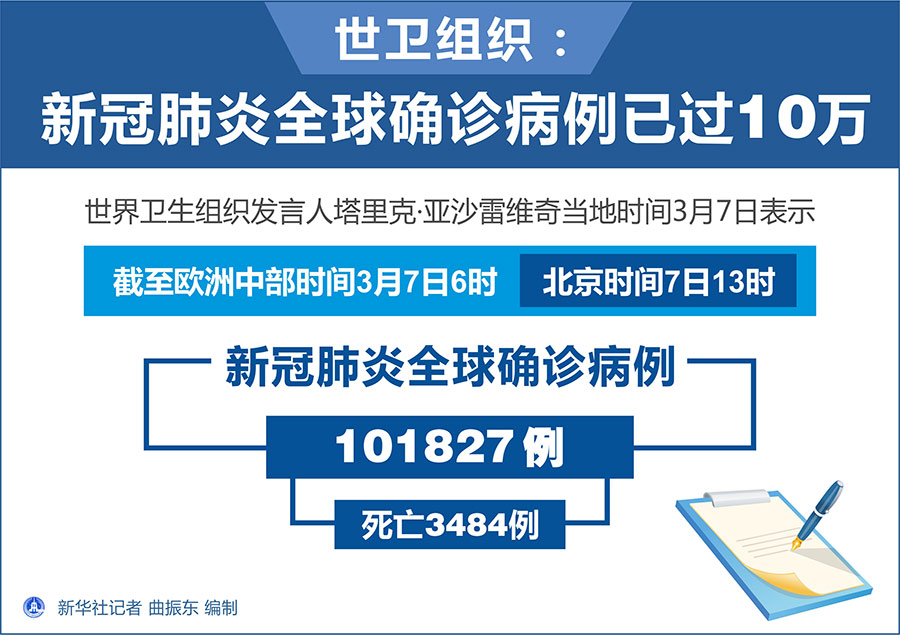 新華社日內(nèi)瓦3月7日電(記者劉曲 陳俊俠)世界衛(wèi)生組織發(fā)言人塔里克·亞沙雷維奇7日對(duì)新華社記者說(shuō),新冠肺炎全球確診病例數(shù)已突破10萬(wàn)。