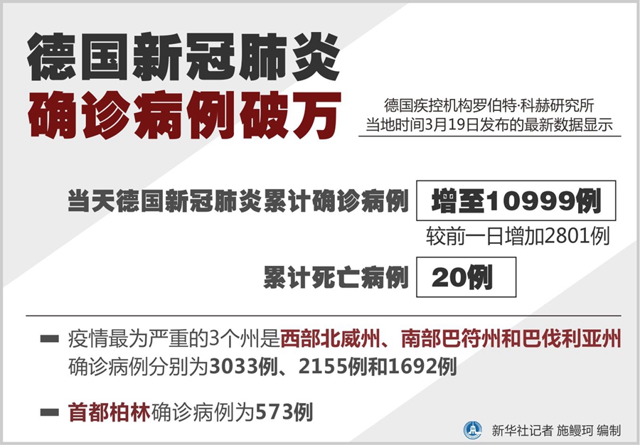 新華社柏林3月19日電(記者張毅榮 田穎)德國疾控機構(gòu)羅伯特·科赫研究所19日發(fā)布的最新數(shù)據(jù)顯示,當(dāng)天德國新冠肺炎累計確診病例增至10999例,較前一日增加2801例,累計死亡病例20例。