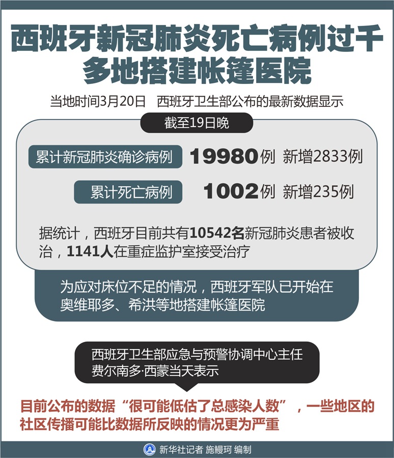 新華社馬德里3月20日電(謝宇智)西班牙衛(wèi)生部20日公布的最新數(shù)據(jù)顯示,截至19日晚,西班牙累計新冠肺炎確診病例19980例,新增2833例;累計死亡病例1002例,新增235例。
