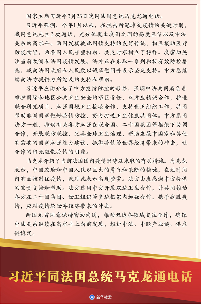 習近平應(yīng)詢介紹了中方疫情防控的形勢,強調(diào)中法共同肩負著維護國際和地區(qū)公共衛(wèi)生安全的艱巨責任,雙方應(yīng)精誠合作,推進聯(lián)合研究項目,加強國境衛(wèi)生檢疫合作,支持世衛(wèi)組織工作,共同幫助非洲國家做好疫情防控,努力打造衛(wèi)生健康共同體。中方愿同法方一道,推動有關(guān)各方加強在聯(lián)合國、二十國集團等框架下協(xié)調(diào)合作,開展聯(lián)防聯(lián)控,完善全球衛(wèi)生治理,幫助發(fā)展中國家和其他有需要的國家加強能力建設(shè),抵御疫情給世界經(jīng)濟帶來的沖擊,讓合作的陽光驅(qū)散疫情的陰霾。