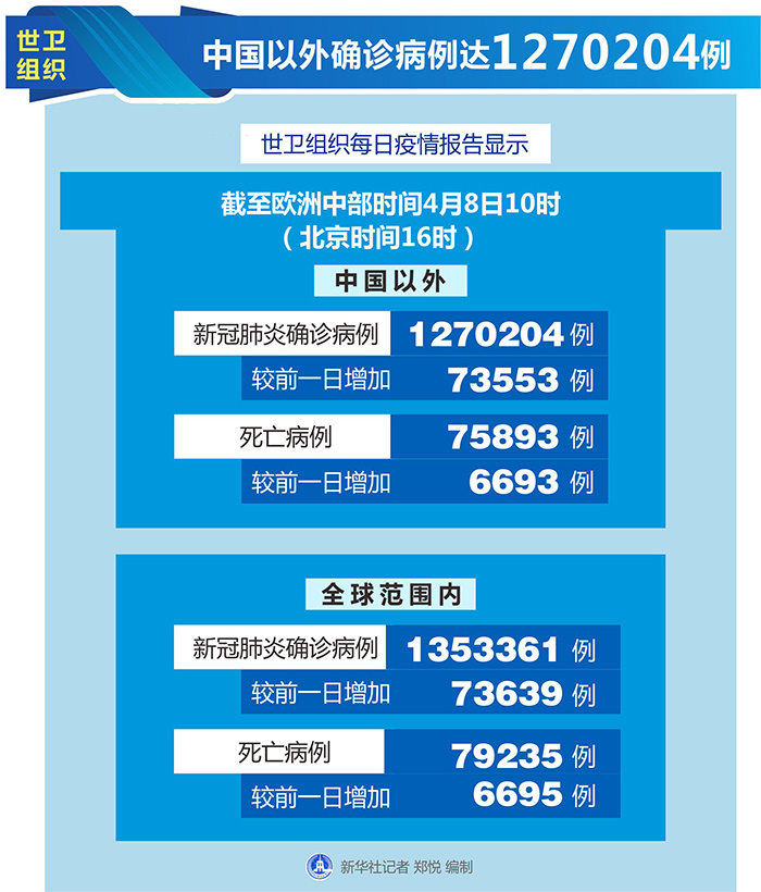 世衛(wèi)組織每日疫情報告顯示,截至歐洲中部時間8日10時(北京時間16時),中國以外確診病例較前一日增加73553例,達(dá)到1270204例;中國以外死亡病例較前一日增加6693例,達(dá)到75893例。