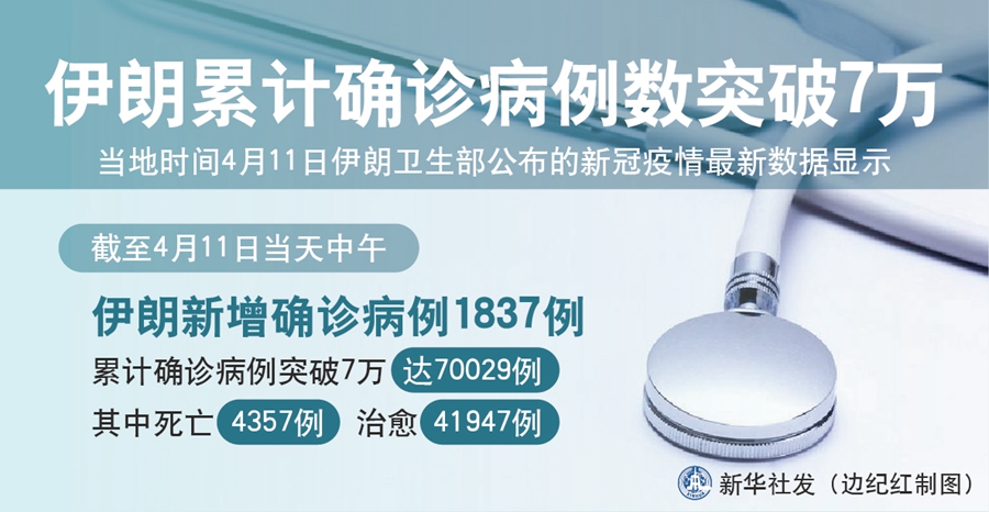 新華社德黑蘭4月11日電(記者陳霖)伊朗衛(wèi)生部11日公布的新冠疫情最新數(shù)據(jù)顯示,截至當天中午,伊朗新增確診病例1837例,累計確診病例突破7萬,達70029例,其中死亡4357例,重癥3987例,治愈41947例。