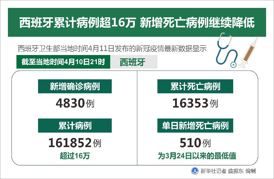 新華社馬德里4月11日電(謝宇智)西班牙衛(wèi)生部11日發(fā)布的新冠疫情最新數(shù)據(jù)顯示,截至當(dāng)?shù)貢r(shí)間10日21時(shí),西班牙新增確診病例4830例,累計(jì)病例數(shù)超過16萬,達(dá)到161852例;累計(jì)死亡病例達(dá)16353例,單日新增死亡病例510例,為3月24日以來的最低值。