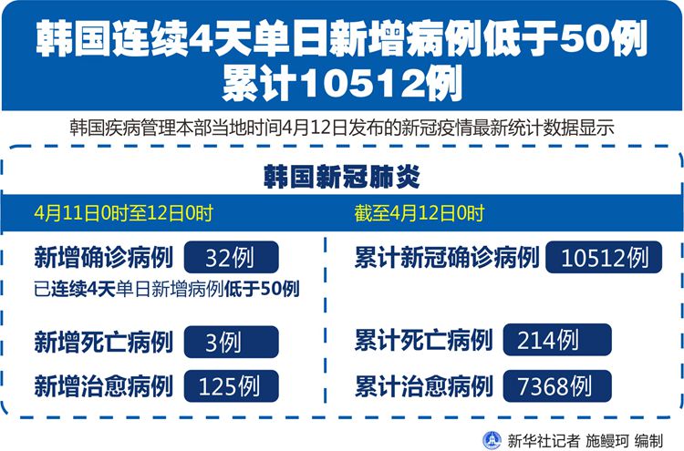 新華社首爾4月12日電(記者陸睿)韓國疾病管理本部12日發(fā)布的新冠疫情最新統(tǒng)計數(shù)據(jù)顯示,當?shù)貢r間11日0時至12日0時,韓國新增32例確診病例,已連續(xù)4天單日新增病例低于50例。