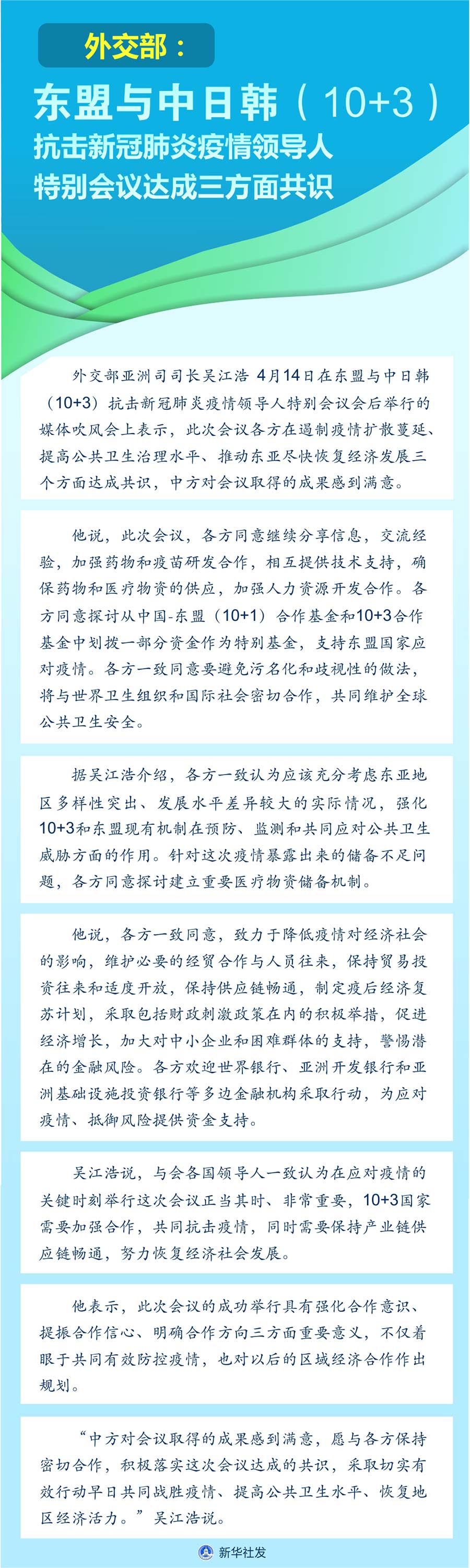 新華社北京4月14日電(記者伍岳)外交部亞洲司司長吳江浩14日在東盟與中日韓(10+3)抗擊新冠肺炎疫情領導人特別會議會后舉行的媒體吹風會上表示,此次會議各方在遏制疫情擴散蔓延、提高公共衛(wèi)生治理水平、推動東亞盡快恢復經濟發(fā)展三個方面達成共識,中方對會議取得的成果感到滿意。