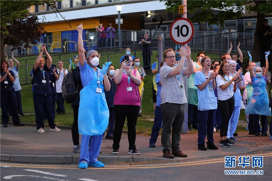 4月23日,在英國(guó)雷丁,皇家伯克郡醫(yī)院的醫(yī)護(hù)人員在醫(yī)院外鼓掌。新冠疫情暴發(fā)以來(lái),每周四晚八時(shí),英國(guó)人在陽(yáng)臺(tái)、門(mén)前或窗前鼓掌,向醫(yī)護(hù)人員致敬。部分醫(yī)院的醫(yī)護(hù)人員也忙里偷閑走出醫(yī)院,感謝人們的支持,也為自己鼓掌加油。新華社發(fā)(蒂姆·愛(ài)爾蘭攝)