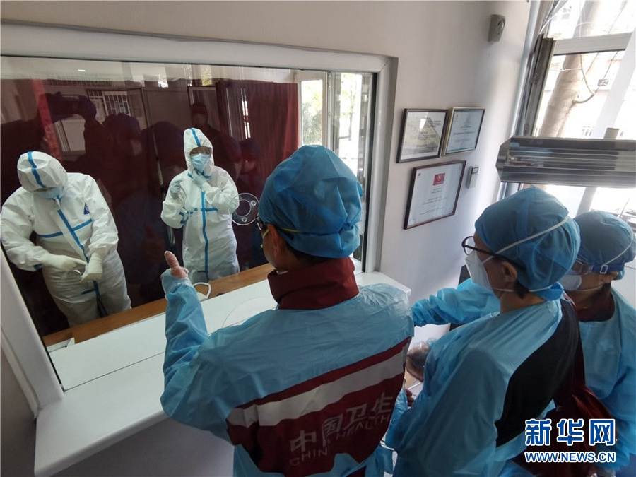 4月11日,在塞爾維亞首都貝爾格萊德,中國(guó)赴塞爾維亞抗疫醫(yī)療專(zhuān)家組在貝爾格萊德一所門(mén)診走訪,為醫(yī)護(hù)人員的防護(hù)意識(shí)點(diǎn)贊。新華社發(fā)(中國(guó)赴塞爾維亞抗疫醫(yī)療專(zhuān)家組供圖)
