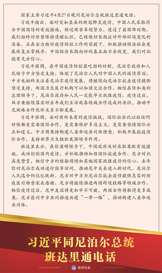 習近平強調(diào),在中國疫情防控最吃勁的時刻,尼泊爾政府和人民給予中方堅定支持,體現(xiàn)了尼泊爾人民對中國人民的深情厚誼。中方也始終關(guān)注著尼泊爾疫情發(fā)展,將繼續(xù)向尼泊爾抗擊疫情提供堅定支持,兩國衛(wèi)生醫(yī)療機構(gòu)可以加強交流合作。相信在你和奧利總理領(lǐng)導(dǎo)下,尼泊爾政府和人民一定能早日戰(zhàn)勝疫情。疫情過后,雙方要繼續(xù)落實好去年我們互訪就各領(lǐng)域合作達成的共識,推動中尼戰(zhàn)略合作伙伴關(guān)系不斷發(fā)展。