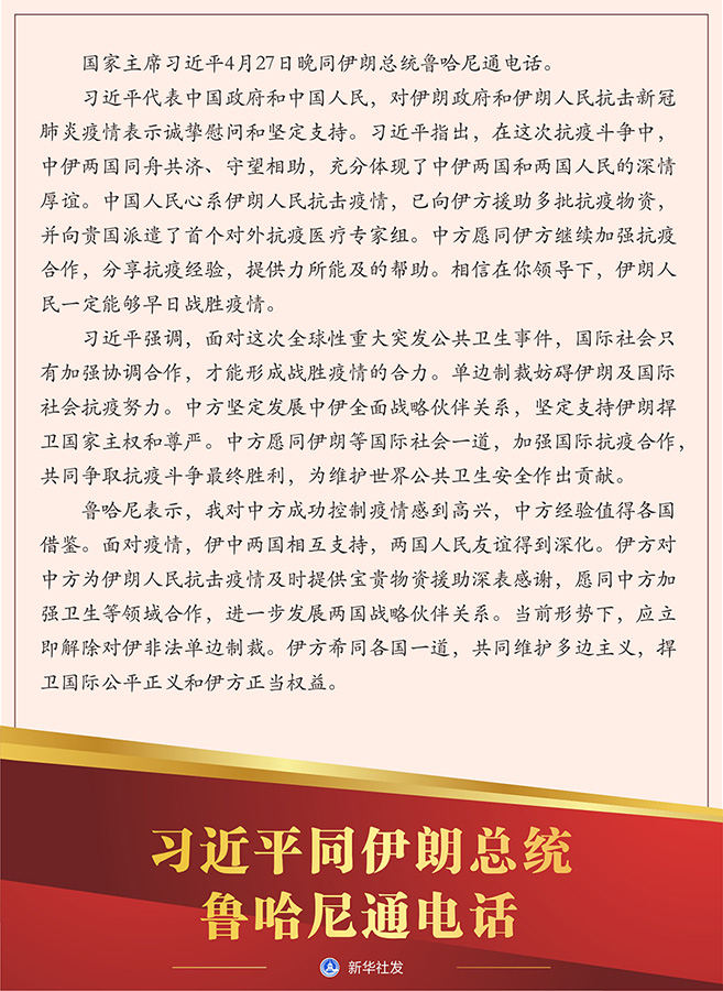 習(xí)近平代表中國(guó)政府和中國(guó)人民,對(duì)伊朗政府和伊朗人民抗擊新冠肺炎疫情表示誠(chéng)摯慰問(wèn)和堅(jiān)定支持。習(xí)近平指出,在這次抗疫斗爭(zhēng)中,中伊兩國(guó)同舟共濟(jì)、守望相助,充分體現(xiàn)了中伊兩國(guó)和兩國(guó)人民的深情厚誼。中國(guó)人民心系伊朗人民抗擊疫情,已向伊方援助多批抗疫物資,并向貴國(guó)派遣了首個(gè)對(duì)外抗疫醫(yī)療專家組。中方愿同伊方繼續(xù)加強(qiáng)抗疫合作,分享抗疫經(jīng)驗(yàn),提供力所能及的幫助。相信在你領(lǐng)導(dǎo)下,伊朗人民一定能夠早日戰(zhàn)勝疫情。