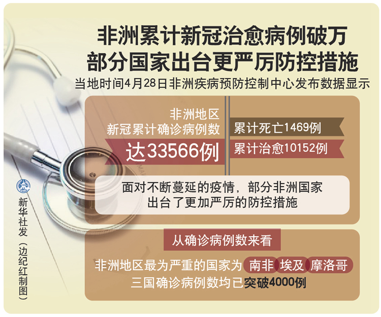 新華社洛美4月28日電 綜合新華社駐非洲地區(qū)記者報(bào)道:非洲疾病預(yù)防控制中心28日發(fā)布數(shù)據(jù)顯示,非洲地區(qū)新冠累計(jì)確診病例數(shù)達(dá)33566例,累計(jì)死亡1469例,累計(jì)治愈10152例。面對不斷蔓延的疫情,部分非洲國家出臺(tái)了更加嚴(yán)厲的防控措施。
