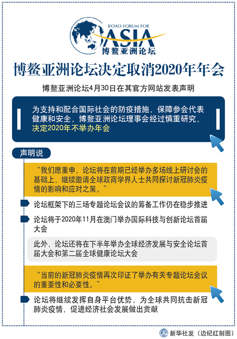 新華社北京4月30日電(記者劉紅霞)博鰲亞洲論壇30日在其官方網(wǎng)站發(fā)表聲明,為支持和配合國(guó)際社會(huì)的防疫措施,保障參會(huì)代表健康和安全,博鰲亞洲論壇理事會(huì)經(jīng)過慎重研究,決定2020年不舉辦年會(huì)。