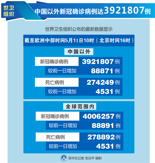 新華社日內(nèi)瓦5月11日電(記者劉曲)世界衛(wèi)生組織11日公布的最新數(shù)據(jù)顯示,中國以外新冠確診病例達到3921807例。