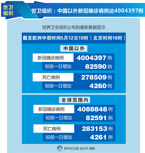 新華社日內瓦5月12日電(記者劉曲)世界衛(wèi)生組織12日公布的最新數(shù)據(jù)顯示,中國以外新冠確診病例達到4004397例。