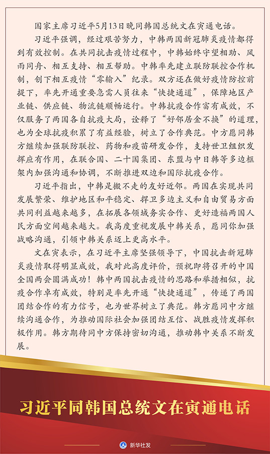 新華社北京5月13日電 國家主席習(xí)近平5月13日晚同韓國總統(tǒng)文在寅通電話。
