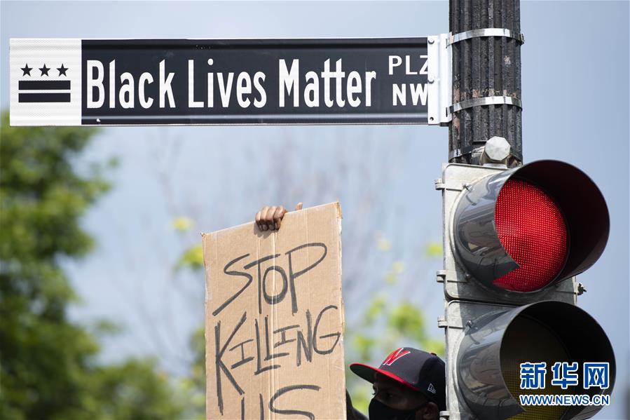 6月6日,一名男子手舉“停止殺害我們”的標(biāo)語在美國華盛頓白宮附近的“黑人的命也是命廣場(chǎng)”路牌下參加游行活動(dòng)。 新華社記者 劉杰 攝