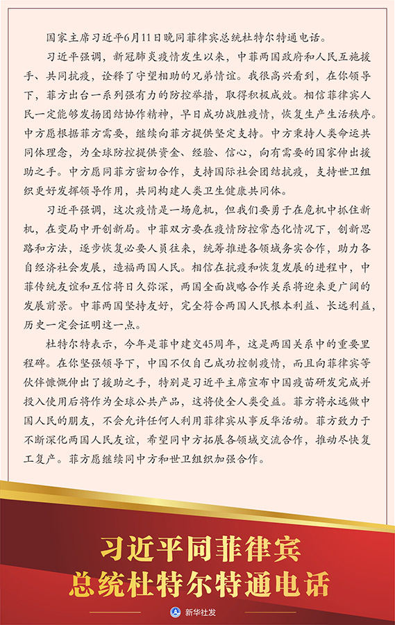 習(xí)近平強(qiáng)調(diào),新冠肺炎疫情發(fā)生以來(lái),中菲兩國(guó)政府和人民互施援手、共同抗疫,詮釋了守望相助的兄弟情誼。我很高興看到,在你領(lǐng)導(dǎo)下,菲方出臺(tái)一系列強(qiáng)有力的防控舉措,取得積極成效。相信菲律賓人民一定能夠發(fā)揚(yáng)團(tuán)結(jié)協(xié)作精神,早日成功戰(zhàn)勝疫情,恢復(fù)生產(chǎn)生活秩序。中方愿根據(jù)菲方需要,繼續(xù)向菲方提供堅(jiān)定支持。中方秉持人類命運(yùn)共同體理念,為全球防控提供資金、經(jīng)驗(yàn)、信心,向有需要的國(guó)家伸出援助之手。中方愿同菲方密切合作,支持國(guó)際社會(huì)團(tuán)結(jié)抗疫,支持世衛(wèi)組織更好發(fā)揮領(lǐng)導(dǎo)作用,共同構(gòu)建人類衛(wèi)生健康共同體。